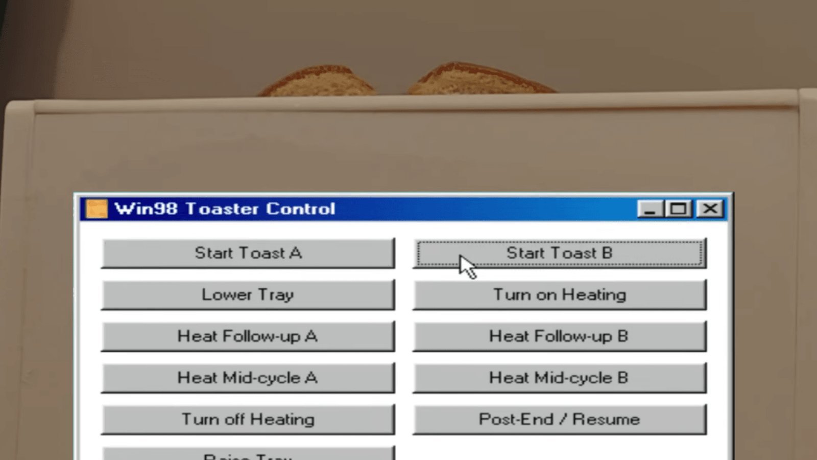 A verdadeira inovação veio com a integração funcional entre o sistema operacional retrô e o eletrodoméstico modificado. 'Throaty Mumbo' criou um aplicativo personalizado dentro do Windows 98, batizado de 'toast.exe'. Este software permitia controlar todas as funcionalidades da torradeira — desde iniciar cada bandeja e levantar/abaixar o suporte, até acionar o aquecimento, alternar ciclos de cocção e interromper o processo — tudo diretamente pela interface gráfica familiar do Windows 98. Para completar a transformação e celebrar a fusão tecnológica, a carcaça original do aparelho foi substituída por uma versão impressa em 3D, personalizada com o icônico logotipo do Windows 98 e o clássico tom bege que remete aos computadores daquela era, elevando o projeto a uma obra de arte geek.